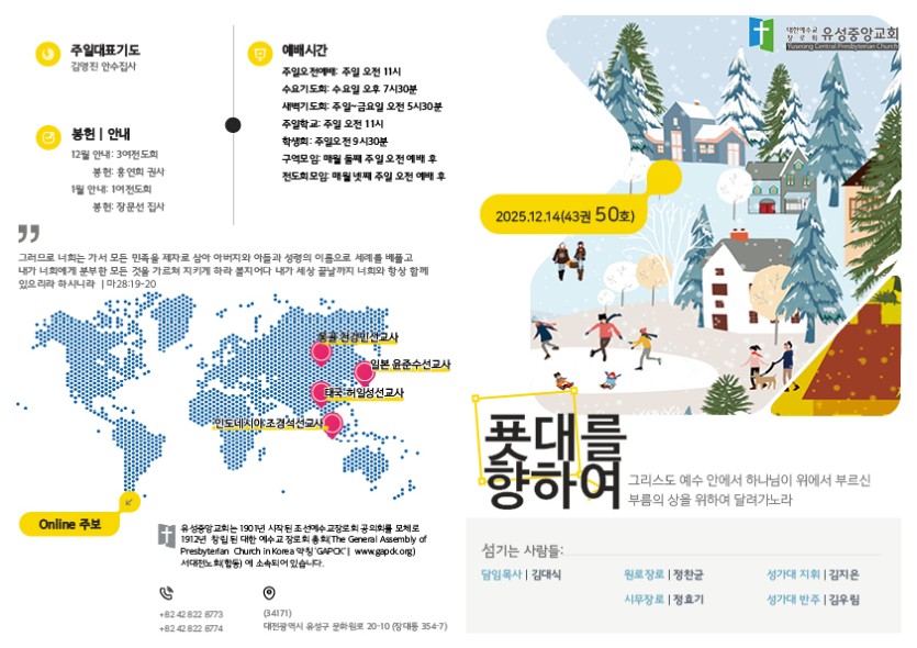 ① 한 해를 마무리하며 우리를 여기까지 인도하신 하나님께 감사드립니다. 12월 한 달도 예배와 사역 가운데 함께해 주시고, 다가오는 성탄의 기쁨이 가정과 삶 가운데 충만하시길 바랍니다.